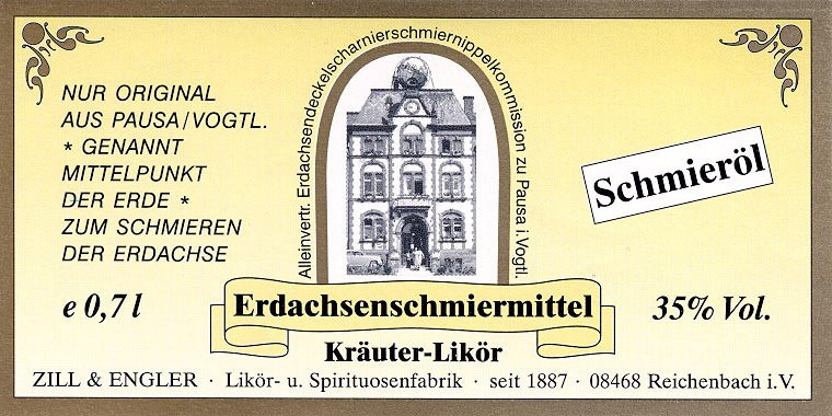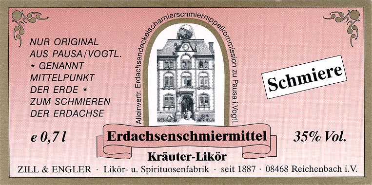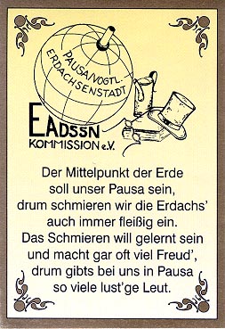Einer alten Tradition genügend, die bis ins 19. Jahrhundert zurückgeht, obliegt es der Erdachsendeckelscharnierschmiernippelkommission dafür zu sorgen, dass in der ERDACHSENSTADT Pausa / Vogtl. die ACHSE immer gut geschmiert wird.Die ERDACHSE befindet sich in den Katakomben des 1892 erbauten Rathauses und kann von